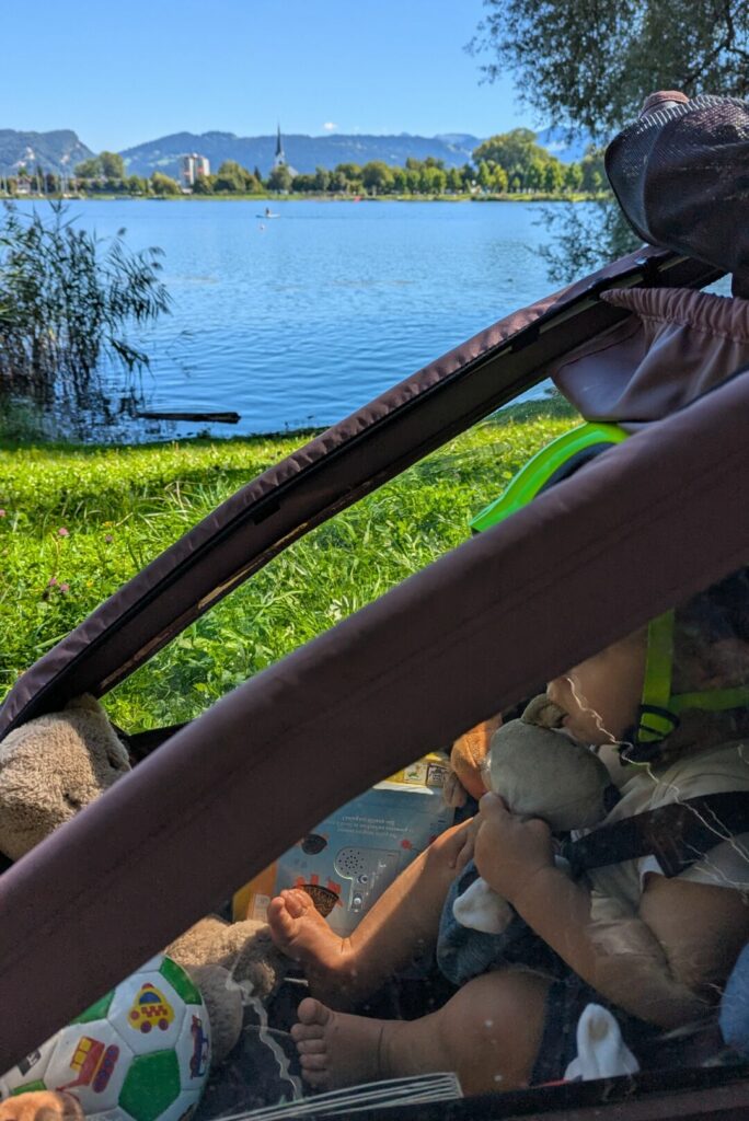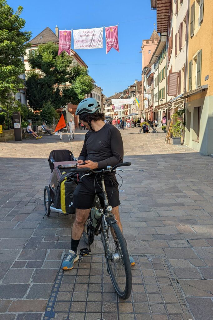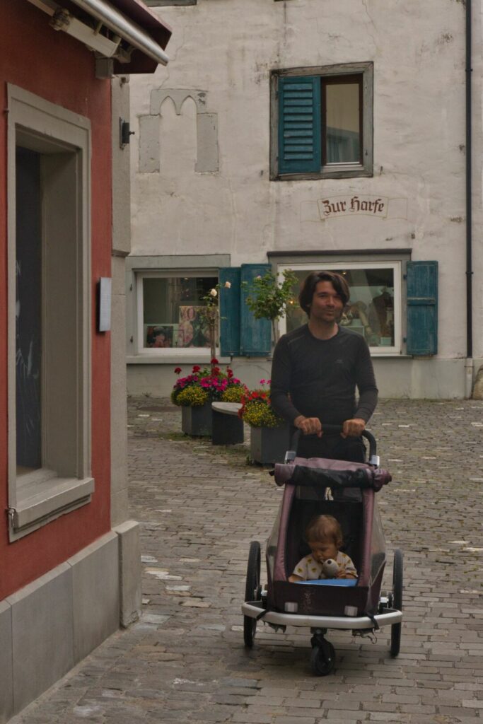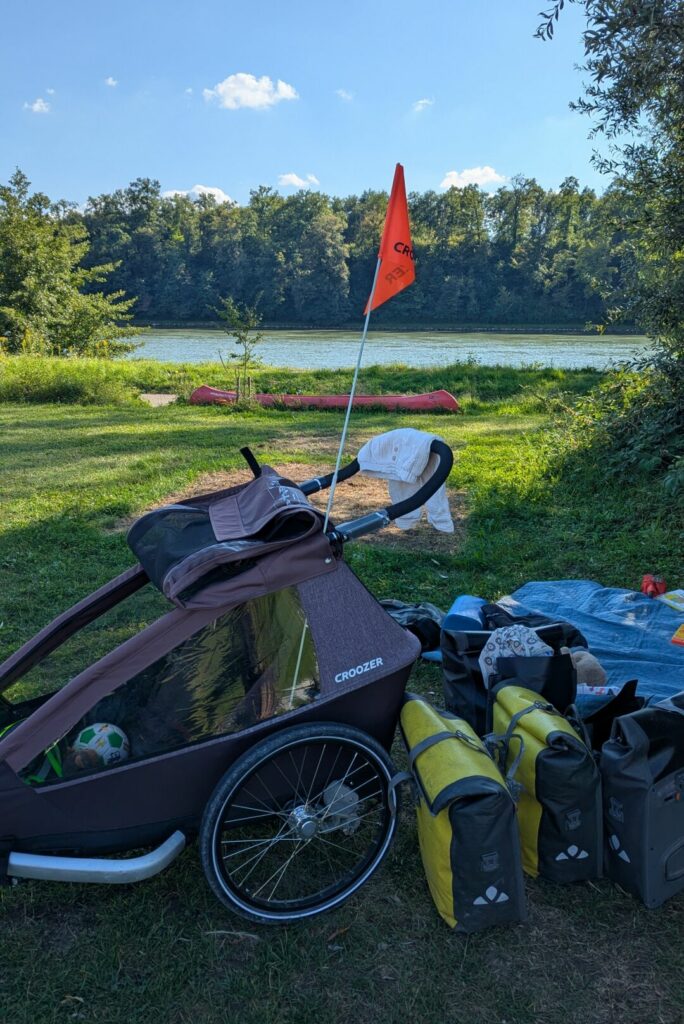 De notre côté, nous avons commencé par de petites sorties autour de chez nous avec Swann dès ses 5 mois (par exemple pour l’emmener à la crèche). Pour les « vrais » voyages de plusieurs jours, nous avons attendu ses 9 mois. Lors de notre première escapade sur la Dolce Via, nous utilisions encore le hamac bébé dans notre remorque Croozer. Pour les voyages suivants, Swann avait grandi et voyageait déjà assis dans la remorque.