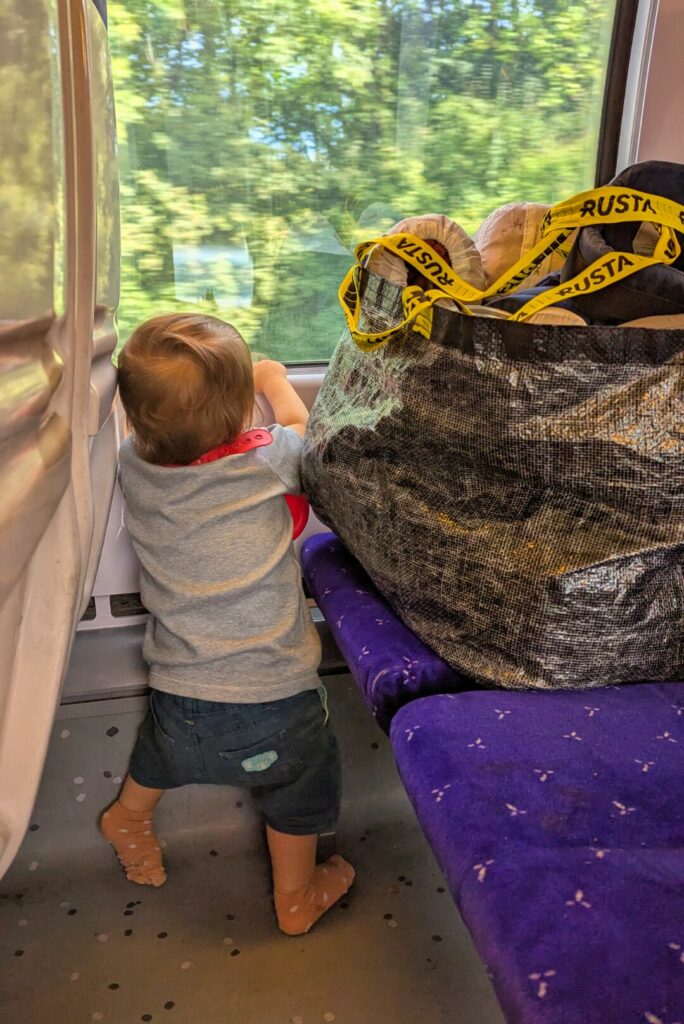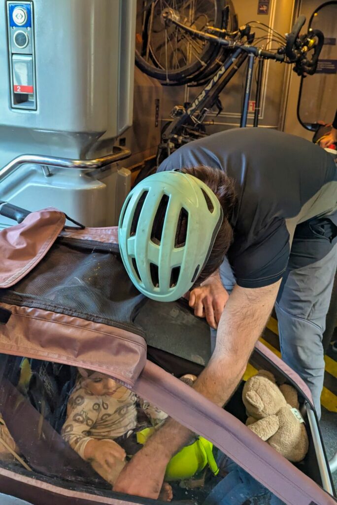 En France, les remorques sont acceptées dans les trains, mais elles doivent être pliées. Notre astuce : emporter un grand sac type IKEA pour mettre tout le contenu de la remorque avant de la plier et de la ranger à côté de nos vélos. En général, c’est Jérémy qui s’en occupe pendant que je trouve une place dans le train avec Swann en portage et m’occupe des sacoches.