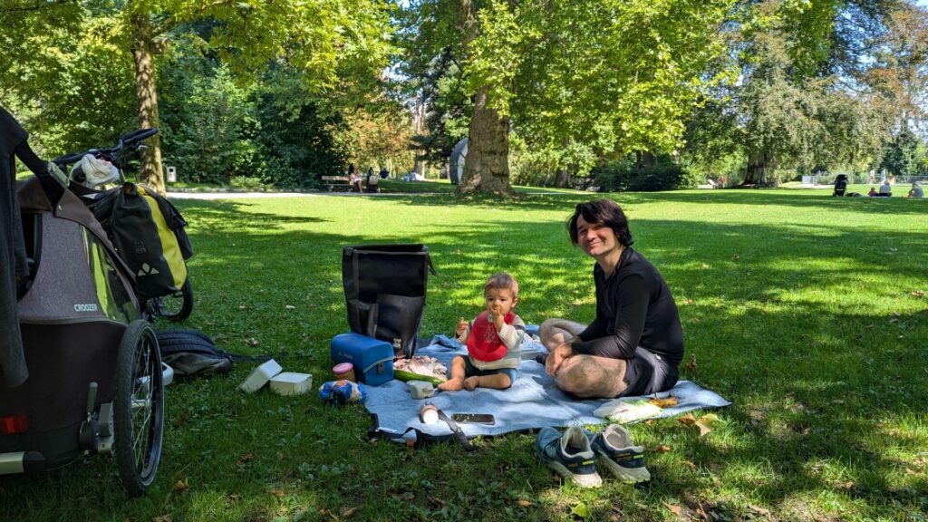 Pourtant, quelques mois plus tard, nous voilà à pédaler le long de véloroutes françaises et européennes, Swann installé confortablement dans sa remorque, observant le paysage, découvrant le monde à sa manière. Chaque journée devenait une petite aventure, faite de pauses improvisées, de pique-niques au bord de l’eau et de moments complices.