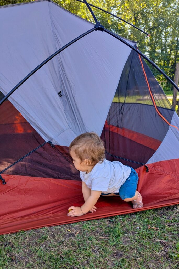- Quand Swann se réveille, nous le changeons et l’habillons dans la tente (pratique si les affaires sont préparées la veille), puis nous sortons pour le petit-déjeuner et un peu de jeu (si le sol n’est pas trop humide).