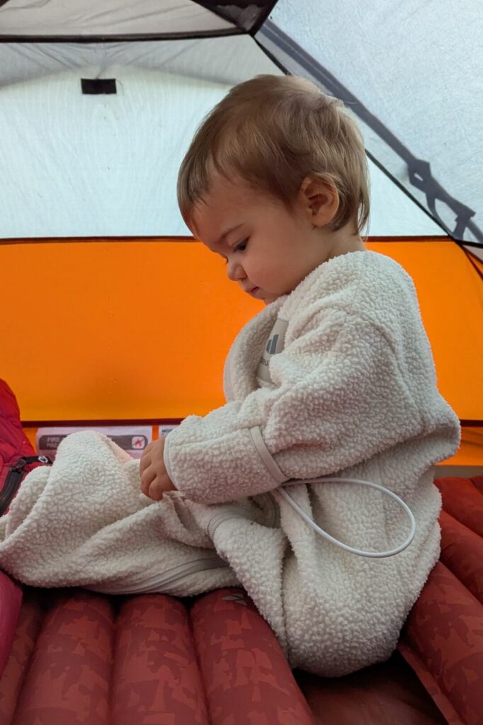 Le plus difficile avec la tente reste la lumière du jour. Swann est habitué à dormir dans l’obscurité totale à la maison, donc les premières nuits sont parfois compliquées : il a du mal à s’endormir et se réveille très tôt (parfois avant 6 h). Notre seule astuce : partir plutôt en fin d’été, quand les nuits sont un peu plus longues. Sinon, Swann s’habitue en quelques jours et parvient à dormir plus longtemps même quand les journées sont longues.