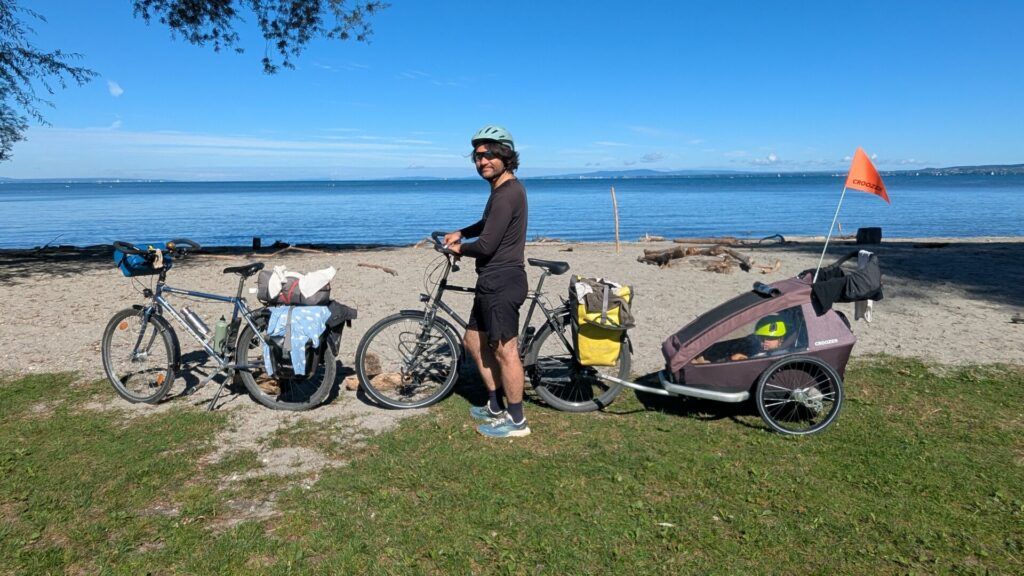 Nous avons testé le train avec nos deux vélos et notre remorque (en France et en Suisse), différents hébergements (hôtel, gîte, camping sous la tente) ainsi que des itinéraires variés, entre véloroutes balisées et tracés plus « maison ». Bref, nous commençons à avoir une petite expérience du voyage à vélo avec un jeune enfant.